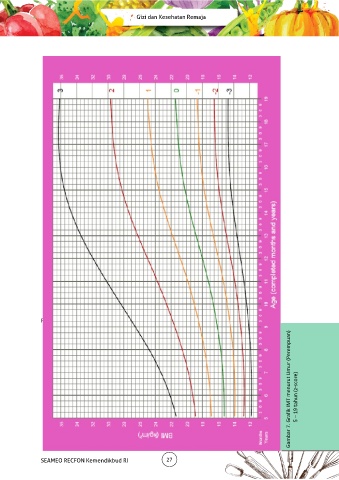 Gizi dan Kesehatan Remaja Pemantauan status gizi penting untuk dilakukan agar remaja dapat menyesuaikan pola 5 – 19 tahun (z-score) Gambar 7. Grafik IMT menurut Umur (Perempuan) SEAMEO RECFON Kemendikbud RI 27