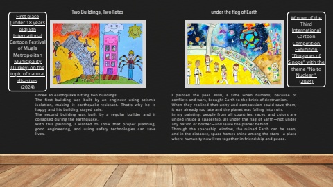 IdrewanearthquakehittingtwobuildingsThefirstbuildingwasbuiltbyanengisolation,makingitearthquake-resistanhappyandhisbuildingstayedsafe.Thesecondbuildingwasbuiltbyaregcollapsedduringtheearthquake.Withthispainting,Iwantedtoshowthgoodengineering,andusingsafetyteclives.TwoBuildings,TwoFatesIpaintedtheyear3000,atimewhenhumans,becauseofconflictsandwars,broughtEarthtothebrinkofdestruction.Whentheyrealizedthatunityandcompassioncouldsavethem,itwasalreadytoolateandtheplanetwasfallingintoruin.Inmypainting,peoplefromallcountries,races,andcolorsareunitedinsideaspaceship,allundertheflagofEarth%u2014notunderanynationorborder%u2014andleavetheplanetbehind.Throughthespaceshipwindow,theruinedEarthcanbeseen,andinthedistance,spacehomesshineamongthestars%u2014aplacewherehumanitynowlivestogetherinfriendshipandpeace.undertheflagofEarthFirstplace(under18yearsold)5thInternationalCartoonFestivalofMuglaMetropolitanMunicipality(Turkey)onthetopicofnaturaldisasters(2024)WinneroftheThirdInternationalCartoonCompetitionExhibition\Sinope\theme\Nuclear\(2024)