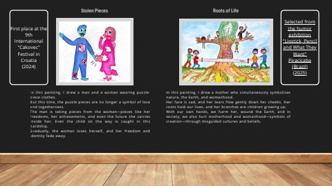 Inthispainting,Idrewamanandawopiececlothes.Butthistime,thepuzzlepiecesarenolonandtogetherness.Themanistakingpiecesfromthewomfreedoms,herachievements,andeventhinsideher.Eventhechildonthewahardship.Gradually,thewomanlosesherself,anStolenPiecesInthispainting,Idrewamotherwhosimultaneouslysymbolizesnature,theEarth,andwomanhood.Herfaceissad,andhertearsflowgentlydownhercheeks.Herrootsholdourlives,andherbranchesarechildrengrowingup.Withourownhands,weharmher,woundtheEarth,andinsociety,wealsohurtmotherhoodandwomanhood%u2014symbolsofcreation%u2014throughmisguidedculturesandbeliefs.RootsofLifeSelectedfromthehumorexhibition\,PencilandWhatTheyWant\Piracicaba(Brazil)(2025)Firstplaceatthe9thInternational\FestivalinCroatia(2024)