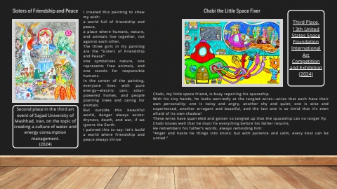 Icreatedthispaintingtoshowmywish:aworldfulloffriendshipandpeace,aplacewherehumans,nature,andanimalslivetogether,notagainsteachother.Thethreegirlsinmypaintingarethe%u201cSistersofFriendshipandPeace%u201d:onesymbolizesnature,onerepresentsfreeanimals,andonestandsforresponsiblehumans.Inthecenterofthepainting,everyoneliveswithpureenergy%u2014electriccars,solarpoweredhomes,andpeopleplantingtreesandcaringforanimals.Butoutsidethisbeautifulworld,dangeralwaysexists:dryness,death,andwar,ifweignoretheEarth.Ipaintedthistosay:let%u2019sbuildaworldwherefriendshipandpeacealwaysthriveSistersofFriendshipandPeaceChabi,mylittlespacefriend,isbusyrepairinghisspaceship.Withhistinyhands,helooksworriedlyatthetangledwires%u2014wiresthateachhavetheirownpersonality:oneisnoisyandangry,anothershyandquiet;oneiswiseandexperienced,anotherarrogantandboastful,andthelastoneissotimidthatit%u2019sevenafraidofitsownshadow!Thesewireshavequarreledandgottensotangledupthatthespaceshipcannolongerfly.Chabiknowswellthathemustfixeverythingbeforehisfatherreturns.Heremembershisfather%u2019swords,alwaysremindinghim:%u201cAngerandhastetiethingsintoknots;butwithpatienceandcalm,everyknotcanbeuntied.%u201dChabitheLittleSpaceFixerThirdPlace,13thUnitedStatesSpaceFoundationInternationalArtCompetitionandExhibition(2024)SecondplaceinthethirdarteventofSajjadUniversityofMashhad,Iran,onthetopicofcreatingacultureofwaterandenergyconsumptionmanagement.(2024)