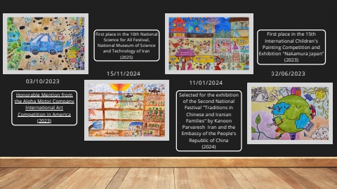 03/10/2023HonorableMentionfromtheAlphaMotorCompanyInternationalArtCompetitioninAmerica(2023)15/11/2024Firstplaceinthe10thNationalScienceforAllFestival,NationalMuseumofScienceandTechnologyofIran(2025)11/01/2024SelectedfortheexhibitionoftheSecondNationalFestival\ChineseandIranianFamilies\ParvareshIranandtheEmbassyofthePeople'sRepublicofChina(2024)02/06/2023Firstplaceinthe15thInternationalChildren'sPaintingCompetitionandExhibition\(2023)