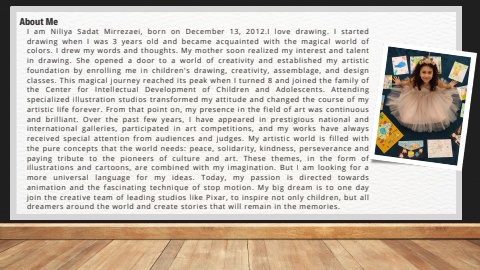 AboutMeIamNiliyaSadatMirrezaei,bornonDecember13,2012.Ilovedrawing.IstarteddrawingwhenIwas3yearsoldandbecameacquaintedwiththemagicalworldofcolors.Idrewmywordsandthoughts.Mymothersoonrealizedmyinterestandtalentindrawing.Sheopenedadoortoaworldofcreativityandestablishedmyartisticfoundationbyenrollingmeinchildren'sdrawing,creativity,assemblage,anddesignclasses.ThismagicaljourneyreacheditspeakwhenIturned8andjoinedthefamilyoftheCenterforIntellectualDevelopmentofChildrenandAdolescents.Attendingspecializedillustrationstudiostransformedmyattitudeandchangedthecourseofmyartisticlifeforever.Fromthatpointon,mypresenceinthefieldofartwascontinuousandbrilliant.Overthepastfewyears,Ihaveappearedinprestigiousnationalandinternationalgalleries,participatedinartcompetitions,andmyworkshavealwaysreceivedspecialattentionfromaudiencesandjudges.Myartisticworldisfilledwiththepureconceptsthattheworldneeds:peace,solidarity,kindness,perseveranceandpayingtributetothepioneersofcultureandart.Thesethemes,intheformofillustrationsandcartoons,arecombinedwithmyimagination.ButIamlookingforamoreuniversallanguageformyideas.Today,mypassionisdirectedtowardsanimationandthefascinatingtechniqueofstopmotion.MybigdreamistoonedayjointhecreativeteamofleadingstudioslikePixar,toinspirenotonlychildren,butalldreamersaroundtheworldandcreatestoriesthatwillremaininthememories.