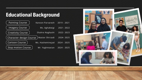 ImageryCoursePaintingCourseCreativityCourseCharacterdesignCourseCartoonCourseStopmotionCourseEducationalBackground2021-2022KanoonParvaresh2019-2021Ms.AghabeigiMr.Yaghmaeian2024-2025Ms.Hasheminejad2024-2025MasterShirzadi2024-2025ShahreNaghashi2022-2023