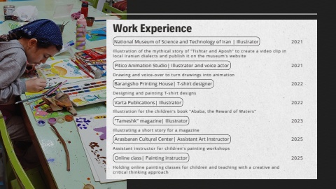 NationalMuseumofScienceandTechnologyofIran|IllustratorWorkExperience2021Illustrationofthemythicalstoryof\localIraniandialectsandpublishitonthemuseum'swebsitePiticoAnimationStudio|Illustratorandvoiceactor2021Drawingandvoice-overtoturndrawingsintoanimationBarangshoPrintingHouse|T-shirtdesigner2022DesigningandpaintingT-shirtdesignsVartaPublications|Illustrator2022Illustrationforthechildren'sbook\\2023IllustratingashortstoryforamagazineArasbaranCulturalCenter|AssistantArtInstructor2025Assistantinstructorforchildren'spaintingworkshopsOnlineclass|Paintinginstructor2025Holdingonlinepaintingclassesforchildrenandteachingwithacreativeandcriticalthinkingapproach
