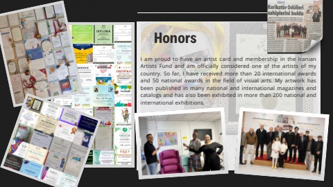 IamproudtohaveanartistcardandmembershipintheIranianArtistsFundandamofficiallyconsideredoneoftheartistsofmycountry.Sofar,Ihavereceivedmorethan20internationalawardsand50nationalawardsinthefieldofvisualarts.Myartworkhasbeenpublishedinmanynationalandinternationalmagazinesandcatalogsandhasalsobeenexhibitedinmorethan200nationalandinternationalexhibitions.Honors