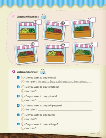 GListen and answer.Track171ADo you want to buy lettuce?BNo, I don%u2019t. ______________________________________________________________________________2ADo you want to buy tomatoes?BNo, I don%u2019t. 3ADo you want to buy spinach?BNo, I don%u2019t. ______________________________________________________________________________4ADo you want to buy bell peppers?BNo, I don%u2019t. ______________________________________________________________________________5ADo you want to buy beans?BNo, I don%u2019t. 6ADo you want to buy cabbage?BNo, I don%u2019t. I want to buy cabbage and tomatoes.13FListen and number.Lesson 2Track16defcba