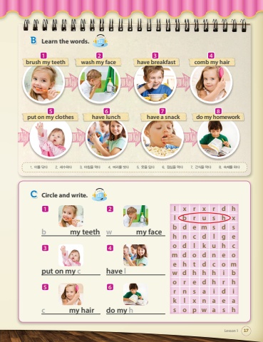brush my teethwash my facehave breakfast comb my hairput on my clotheshave lunch have a snack do my homework17CCircle and write.Track23lxrxrdhlbrushxbdemsdshncdlgeodlkuhcmdodneoehtdcomwdhhhi boredhrhrnsaidi klxnaeasopwashb my teethw my facec my hairdo my hput on my chave lLesson 1125634BLearn the words.Track221.%uc774%ub97c%ub2e6%ub2e42.%uc138%uc218%ud558%ub2e43.%uc544%uce68%uc744%uba39%ub2e44.%uba38%ub9ac%ub97c%ube57%ub2e45.%uc637%uc744%uc785%ub2e46.%uc810%uc2ec%uc744%uba39%ub2e47.%uac04%uc2dd%uc744%uba39%ub2e48.%uc219%uc81c%ub97c%ud558%ub2e412345678