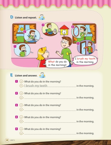 EListen and answer.Track251AWhat do you do in the morning? B_______________________________________________________________________ in the morning.2AWhat do you do in the morning? B_______________________________________________________________________ in the morning.3AWhat do you do in the morning? B_______________________________________________________________________ in the morning.4AWhat do you do in the morning? B_______________________________________________________________________ in the morning.5AWhat do you do in the morning? B_______________________________________________________________________ in the morning.I brush my teeth18UNIT 2125What do you do in the morning?I brush my teethin the morning.43DListen and repeat.Track24