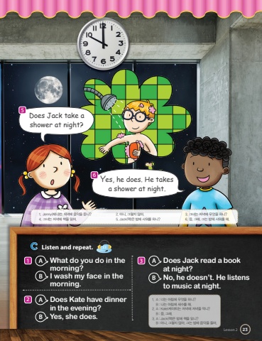 Does Jack take a shower at night? 1.%u0009 A:%u0009%ub108%ub294%uc544%uce68%uc5d0%ubb34%uc5c7%uc744%ud558%ub2c8?%u0009 B:%u0009%ub098%ub294%uc544%uce68%uc5d0%uc138%uc218%ub97c%ud574.2.%u0009A:%u0009Kate(%ucf00%uc774%ud2b8)%ub294%uc800%ub141%uc5d0%uc800%ub141%uc744%uba39%ub2c8?%u0009 B:%u0009%uc751,%uadf8%ub798.%u00093.%u0009A:Jack(%uc7ad)%uc740%ubc24%uc5d0%ucc45%uc744%uc77d%ub2c8?%u0009 B:%uc544%ub2c8,%uadf8%ub807%uc9c0%uc54a%uc544.%uadf8%ub294%ubc24%uc5d0%uc74c%uc545%uc744%ub4e4%uc5b4.CListen and repeat. Track33ABWhat do you do in the morning?I wash my face in the morning.1Does Jack read a book at night?No, he doesn%u2019t. He listens to music at night.AB35Lesson 223Does Kate have dinner in the evening?Yes, she does.AB2Yes, he does. He takes a shower at night.61.%u0009 Jenny(%uc81c%ub2c8)%ub294%uc800%ub141%uc5d0%uc74c%uc545%uc744%ub4e3%ub2c8?%u00092.%u0009%uc544%ub2c8,%uadf8%ub807%uc9c0%uc54a%uc544.%u00093.%u0009%uadf8%ub140%ub294%uc800%ub141%uc5d0%ubb34%uc5c7%uc744%ud558%ub2c8?4.%u0009%uadf8%ub140%ub294%uc800%ub141%uc5d0%ucc45%uc744%uc77d%uc5b4.%u00095.%u0009Jack(%uc7ad)%uc740%ubc24%uc5d0%uc0e4%uc6cc%ub97c%ud558%ub2c8?%u00096.%u0009%uc751,%uadf8%ub798.%uadf8%ub294%ubc24%uc5d0%uc0e4%uc6cc%ub97c%ud574.