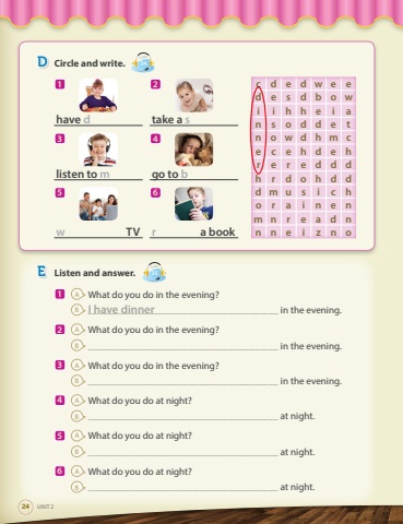 DCircle and write.Track34have dtake a sEListen and answer.Track351AWhat do you do in the evening?B________________________________________________________________________ in the evening.2AWhat do you do in the evening?B in the evening.3AWhat do you do in the evening?B________________________________________________________________________ in the evening.4AWhat do you do at night?B________________________________________________________________________ at night.5AWhat do you do at night?B at night.6AWhat do you do at night?B at night.I have dinnercdedweedesdbowiihheiansoddetnowdhmcecehdehreredddhrdohdddmusichorainenmnreadnw TVr a booknneiznolisten to mgo to b24125634UNIT 2