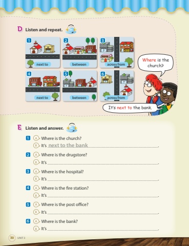 30UNIT 3EListen and answer.Track451AWhere is the church? BIt%u2019s _________________________________________________________________________________________.2AWhere is the drugstore? BIt%u2019s .3AWhere is the hospital?BIt%u2019s _________________________________________________________________________________________.4AWhere is the fire station?BIt%u2019s _________________________________________________________________________________________.5AWhere is the post office?BIt%u2019s .6AWhere is the bank? BIt%u2019s .next to the bank124635It%u2019s next to the bank.Where is the church?DListen and repeat.Track44across from across from betweenbetweennext tonext to
