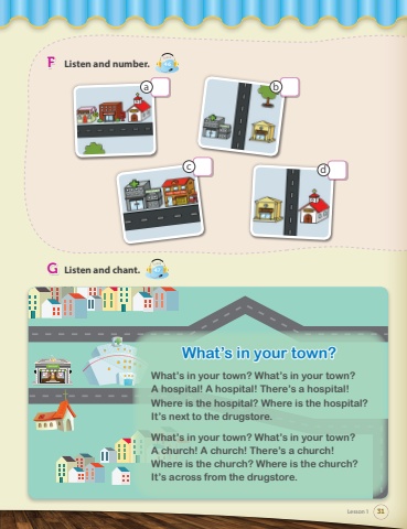 31GListen and chant.Track47FListen and number.Track46Lesson 1dcabWhat%u2019s in your town? What%u2019s in your town? A hospital! A hospital! There%u2019s a hospital!Where is the hospital? Where is the hospital?It%u2019s next to the drugstore.What%u2019s in your town? What%u2019s in your town?A church! A church! There%u2019s a church!Where is the church? Where is the church?It%u2019s across from the drugstore.What%u2019s in your town?