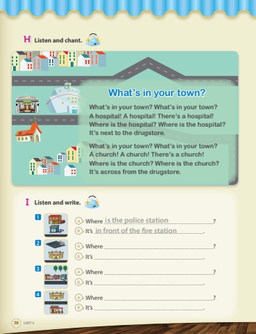 HListen and chant.Track58IListen and write.Track59AWhere ?BIt%u2019s .AWhere _________________________________________________________________?BIt%u2019s _________________________________________________________________.AWhere ?BIt%u2019s .AWhere ?BIt%u2019s .1234in front of the fire stationis the police station38UNIT 3What%u2019s in your town? What%u2019s in your town? A hospital! A hospital! There%u2019s a hospital!Where is the hospital? Where is the hospital?It%u2019s next to the drugstore.What%u2019s in your town? What%u2019s in your town?A church! A church! There%u2019s a church!Where is the church? Where is the church?It%u2019s across from the drugstore.What%u2019s in your town?
