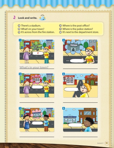 JLook and write.Track60Lesson 239aThere%u2019s a stadium. bWhere is the post office?cWhat%u2019s in your town?dWhere is the police station?eIt%u2019s across from the fire station. fIt%u2019s next to the department store.What%u2019s in your town?c??125634?