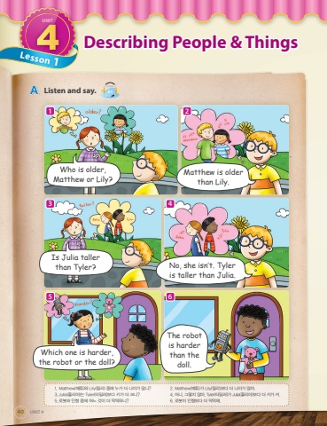 404Describing People & ThingsLesson1UNITAListen and say.Track61UNIT 4No, she isn%u2019t. Tyler is taller than Julia. The robot is harder than the doll.156342Who is older, Matthew or Lily?Matthew is older than Lily.1.%u0009 Matthew(%ub9e4%ud29c)%uc640Lily(%ub9b4%ub9ac)%uc911%uc5d0%ub204%uac00%ub354%ub098%uc774%uac00%ub9ce%ub2c8?%u0009 2.%u0009Matthew(%ub9e4%ud29c)%uac00Lily(%ub9b4%ub9ac)%ubcf4%ub2e4%ub354%ub098%uc774%uac00%ub9ce%uc544.3.Julia(%uc904%ub9ac%uc544)%ub294Tyler(%ud0c0%uc77c%ub7ec)%ubcf4%ub2e4%ud0a4%uac00%ub354%ud06c%ub2c8?%u00094.%u0009%uc544%ub2c8,%uadf8%ub807%uc9c0%uc54a%uc544.Tyler(%ud0c0%uc77c%ub7ec)%uac00Julia(%uc904%ub9ac%uc544)%ubcf4%ub2e4%ub354%ud0a4%uac00%ucee4.5.%ub85c%ubd07%uacfc%uc778%ud615%uc911%uc5d0%uc5b4%ub290%uac83%uc774%ub354%ub531%ub531%ud558%ub2c8?%u00096.%u0009%ub85c%ubd07%uc774%uc778%ud615%ubcf4%ub2e4%ub354%ub531%ub531%ud574.Is Julia taller than Tyler?Which one is harder, the robot or the doll?