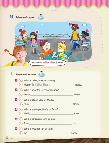 HListen and repeat.Track68 IListen and answer.Track691AWho is taller, Mason or Betty?BMason ____________________________________________________________ Betty.2AWho is shorter, Betty or Mason? BBetty Mason.3AWho is older, Sam or Molly?BSam ____________________________________________________________ Molly.4AWho is younger, Molly or Sam?BMolly ____________________________________________________________ Sam.5AWho is stronger, Tom or Ian?BTom Ian.6AWho is weaker, Ian or Tom?BIan Tom.is taller than44UNIT 4654321Mason is taller than Betty.MasonBettyTomSamIanMolly