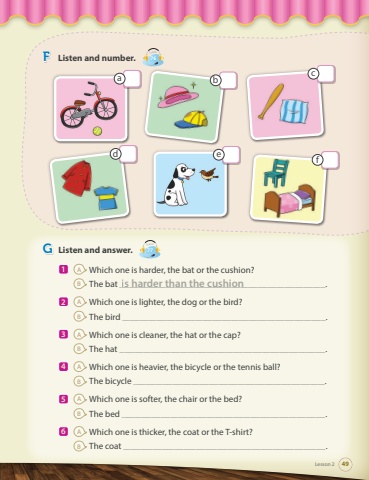 GListen and answer.Track771AWhich one is harder, the bat or the cushion? BThe bat _____________________________________________________________________________________.2AWhich one is lighter, the dog or the bird?BThe bird .3AWhich one is cleaner, the hat or the cap?BThe hat _____________________________________________________________________________________.4AWhich one is heavier, the bicycle or the tennis ball?BThe bicycle _______________________________________________________________________________.5AWhich one is softer, the chair or the bed?BThe bed .6AWhich one is thicker, the coat or the T-shirt?BThe coat .is harder than the cushionLesson 249FListen and number.Track76efdcab
