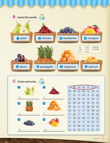 5CCircle and write.Track03rpearsrbdumsdslocntepuhheadiemehnnnbarxgdeenrredargitrhproemidpiesinnlesmnenesoasszspc12pt34Lesson 1bm6BLearn the words.Track025plumspineapplestangerinesapricotspearscherriesblueberriesmangoes1.%u0009 %ubc30%u0009 2.%u0009%uccb4%ub9ac%u0009 3.%u0009%ube14%ub8e8%ubca0%ub9ac%u00094.%u0009%ub9dd%uace0%u0009 5.%u0009%uc790%ub450%u0009 6.%u0009%ud30c%uc778%uc560%ud50c7.%u0009%uade4%u0009 8.%u0009%uc0b4%uad6c12345678