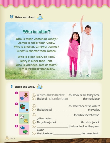 HListen and chant.Track78 IListen and write.Track7950UNIT 4A___________________________________________, the book or the teddy bear?BThe book ________________________________________________ the teddy bear.A___________________________________________, the backpack or the wallet?BThe backpack ________________________________________________ the wallet.A__________________________________________________, the white jacket or the yellow jacket?BThe yellow jacket _________________________________ the white jacket.A, the blue book or the green book?BThe blue book the green book.Which one is harderis harder than1234Who is taller?Who is taller, James or Cindy?James is taller than Cindy.Who is shorter, Cindy or James?Cindy is shorter than James.Who is older, Mary or Tom?Mary is older than Tom.Who is younger, Tom or Mary?Tom is younger than Mary.