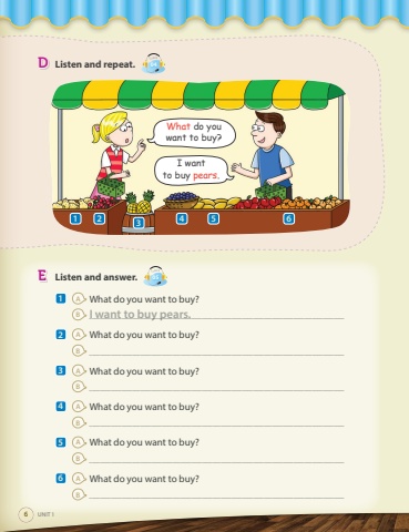 6DListen and repeat.Track04EListen and answer.Track05UNIT 11AWhat do you want to buy?B_______________________________________________________________________________________________2AWhat do you want to buy?B3AWhat do you want to buy?B_______________________________________________________________________________________________4AWhat do you want to buy?B_______________________________________________________________________________________________5AWhat do you want to buy?B6AWhat do you want to buy?BI want to buy pears.132456What do you want to buy?I want to buy pears.