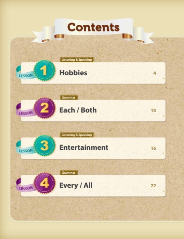 Listening & SpeakingListening & SpeakingGrammarGrammarContentsLesson1HobbiesLesson3EntertainmentLesson2Each / BothLesson4Every / All4102216