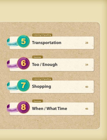 Listening & SpeakingListening & SpeakingGrammarGrammarLesson7ShoppingLesson5TransportationLesson8When / What TimeLesson6Too / Enough34284640