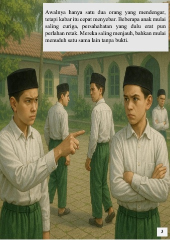 Awalnya hanya satu dua orang yang mendengar, tetapi kabar itu cepat menyebar. Beberapa anak mulai saling curiga, persahabatan yang dulu erat pun perlahan retak. Mereka saling menjauh, bahkan mulai menuduh satu sama lain tanpa bukti.3