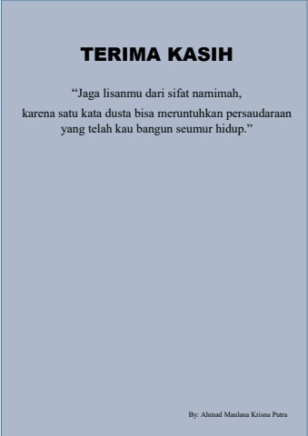 TERIMA KASIH%u201cJaga lisanmu dari sifat namimah, karena satu kata dusta bisa meruntuhkan persaudaraan yang telah kau bangun seumur hidup.%u201dBy: Ahmad Maulana Krisna Putra