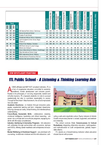 Rank                                   Teacher welfare &   development (100)  Competence of faculty (200)  Academic reputation (100)  Co-curricular education &   internationalism (100)  Sports education (100)  Curriculum & pedagogy(100)  Individual attention to   students (100)  Leadership / management   Parental involvement (100)  Infrastructure provision (100)   Mental & emotional well-being   Special needs education (100)  Va