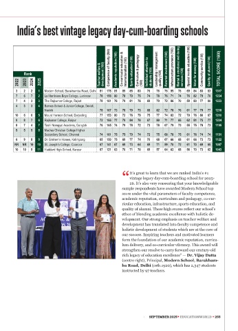 Rank Competence of faculty (200) Academic reputation (100) Co-curricular education & internationalism (100) Sports education (100) Curriculum & pedagogy Individual attention to Leadership / management Parental involvement (100) Infrastructure provision (100) Mental & emotional well-being Special needs education (100) Value for money (100) Community service (100) Quality of a
