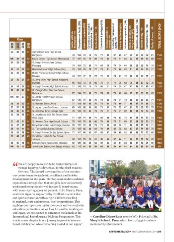 Rank Competence of faculty (200) Academic reputation (100) Co-curricular education & internationalism (100) Sports education (100) Curriculum & pedagogy (100) Individual attention to Leadership / management Parental involvement (100) Infrastructure provision (100) Mental & emotional well- being services (100) Special needs education (100) Value for money (100) Community servic