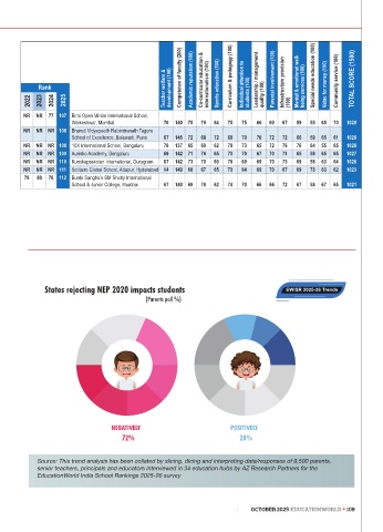 Rank Teacher welfare & development (100) Competence of faculty (200) Academic reputation (100) Co-curricular education & internationalism (100) Sports education (100) Curriculum & pedagogy (100) Individual attention to students (100) Leadership / management Parental involvement (100) Infrastructure provision Mental & emotional well- being services (100) Special needs education