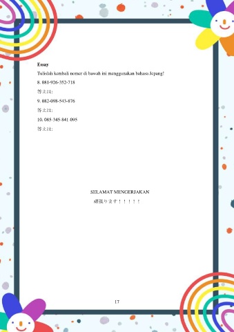 Essay Tulislah kembali nomer di bawah ini menggunakan bahasa Jepang! 8. 081-926-352-718 14 答えは: 9. 082-098-543-876 答えは: 10. 085-345-841-095 答えは: SELAMAT MENGERJAKAN 頑張ります!!!!! 17