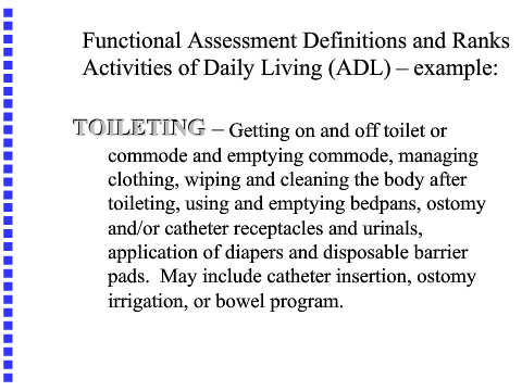 Functional Assessment Definitions and Ranks Activities of Daily Living (ADL) – example: TOILETING TOILETING – Getting on and off toilet or commode and emptying commode, managing clothing, wiping and cleaning the body after toileting, using and emptying bedpans, ostomy and/or catheter receptacles and urinals, application of diapers and disposable barrier pads. May include catheter insertion, ost