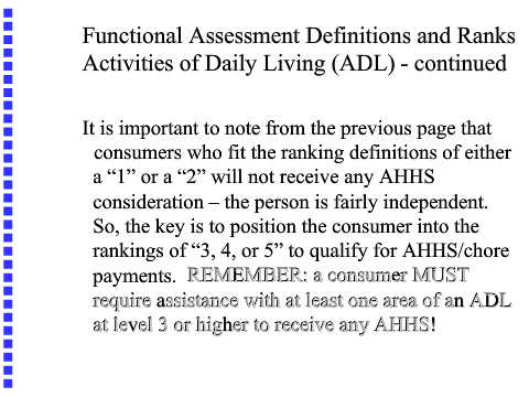 a payments. REMEMBER: a consumer MUST least at require assistance with at least one area of an ADL receive