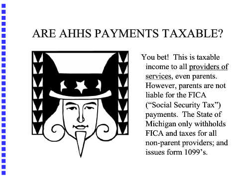 ARE AHHS PAYMENTS TAXABLE? You bet! This is taxable income to all providers of services, even parents. However, parents are not liable for the FICA (“Social Security Tax”) payments. The State of Michigan only withholds FICA and taxes for all non-parent providers; and issues form 1099’s.