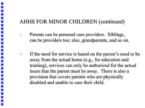 3. Parents can be personal care providers. Siblings, can be providers too; also, grandparents, and so on. If the need for service is based on the parent’s need to be 4. away from the actual home (e.g., for education and training), services can only be authorized for the actual hours that the parent must be away. There is also a provision that covers parents who are physically