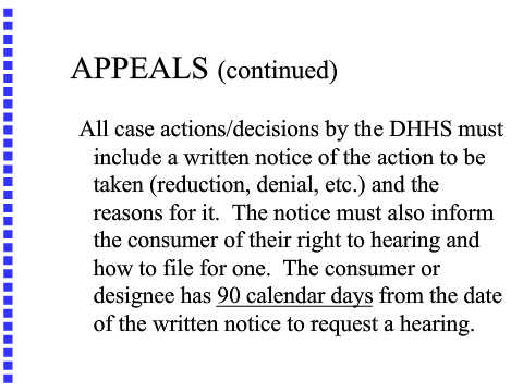 All case actions/decisions by the DHHS must include a written notice of the action to be taken (reduction, denial, etc.) and the reasons for it. The notice must also inform the consumer of their right to hearing and The consumer or how to file for one. designee has 90 calendar days from the date of the written notice to request a hearing.