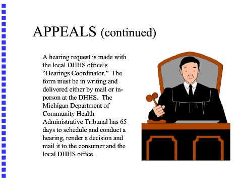 person at the DHHS. Michigan Department of Community Health Administrative Tribunal has 65 days to schedule and conduct a hearing, render a decision and mail it to the consumer and the local DHHS office.
