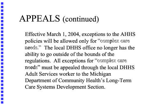 “complex policies will be allowed only for “complex care needs.” The local DHHS office no longer has the “complex All exceptions for “complex care needs” must be appealed through the local DHHS Department of Community Health’s Long-Term