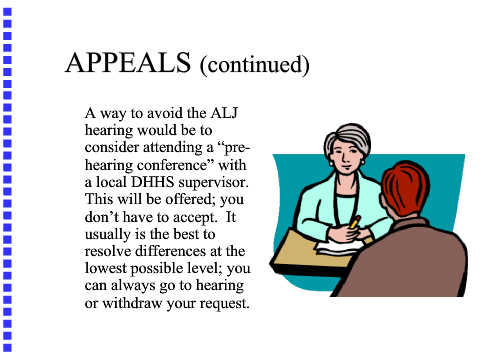 A way to avoid the ALJ hearing would be to consider attending a “pre- hearing conference” with a local DHHS supervisor. This will be offered; you don’t have to accept. It usually is the best to resolve differences at the lowest possible level; you can always go to hearing or withdraw your request.