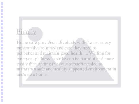 Finally Home care provides individuals with the necessary preventative routines and care they need to get better and maintain good health. ... Waiting for emergency illness to strike can be harmful and more costly than getting the daily support needed to maintain a safe and healthy supported environment in one's own home.
