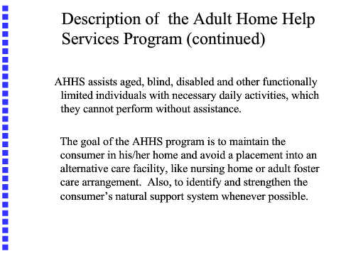 The goal of the AHHS program is to maintain the consumer in his/her home and avoid a placement into an alternative care facility, like nursing home or adult foster Also, to identify and strengthen the care arrangement. consumer’s natural support system whenever possible.
