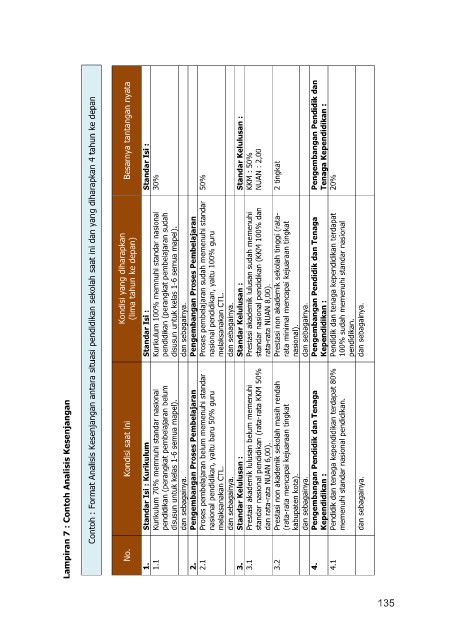 aplikasi database. Lampiran 7 : Contoh Analisis Kesenjangan Kondisi saat ini Standar Isi : Kurikulum Kurikulum 70% memnuhi standar nasional pendidikan (perangkat pembelajaran belum disusun untuk kelas 1-6 semua mapel). Pengembangan Proses Pembelajaran Proses pembelajaran belum memenuhi standar nasional pendidikan, yaitu baru 50% guru Standar Kelulusan : Prestasi