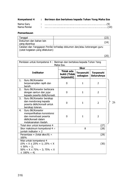 Penilaian untuk Kompetensi 4 : Beriman dan bertakwa kepada Tuhan Yang