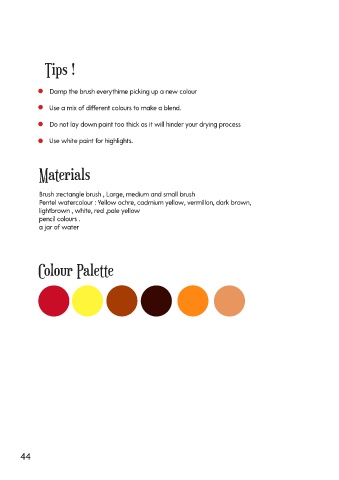 Pentel watercolour : Yellow ochre, cadmium yellow, vermillon, dark brown,