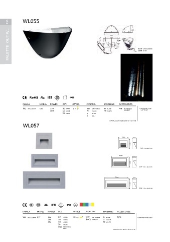 WL  WALL LIGHT 057  1W  22  2200K  60 60°  SW  SWITCHING  B BLACK  N/A  • DIMMING ON REQUEST  WL  WALL LIGHT  059  3W  30 3000K  2  2°   SW  SWITCHING  B  BLACK  GL  GLASS LENS  • OPERATING TEMP.  WL  WALL LIGHT 057  1W  22  2200K  60 60°  SW  SWITCHING  B BLACK  N/A  • DIMMING ON REQUEST  WL  WALL LIGHT  059  3W  30 3000K  2  2°   SW  SWITCHING  B  BLACK  GL  GLASS LENS  • OPERATING TEMP.