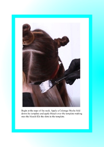 Begin at the nape of the neck. Apply a Colorage Meche fold down the template and apply bleach over the template making sure the bleach fills the slots in the template.