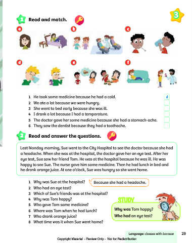 1  Why was Sue at the hospital?            Because she had a headache.