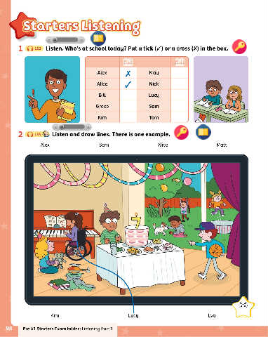 1 0 153 Listen. Who's at school today? Put a tick (V) or a cross (X) in the box.